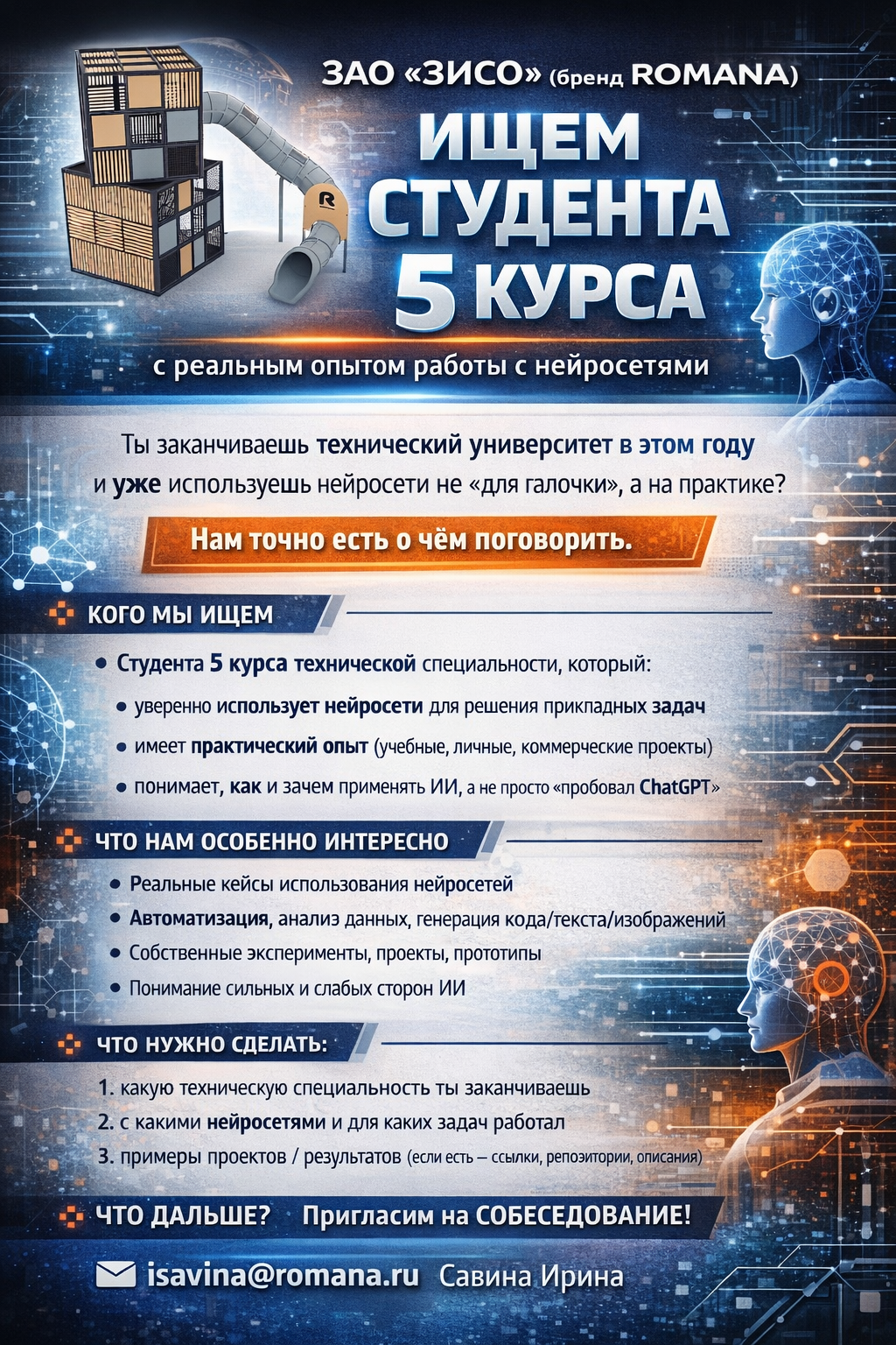 ЗАО "ЗИСО" бренд "ROMANA" ищет студента с реальным опытом работы с нейросетями