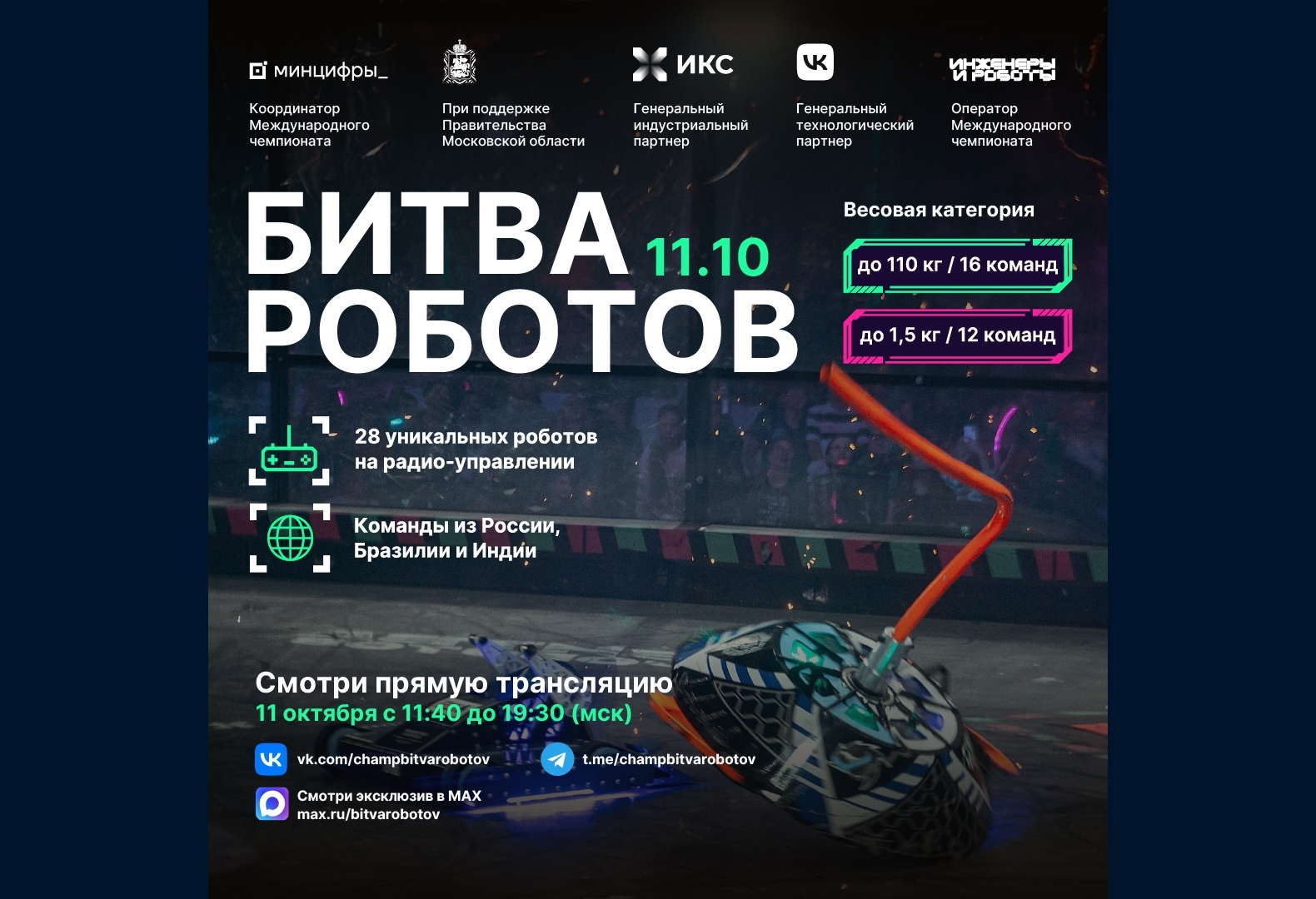 «Битва роботов» — это спортивно-технический чемпионат, на котором инженерные команды соревнуются в проектировании и сражении своих роботов. Соревнования проходят на специализированном высокотехнологичном ринге, где созданные командами роботы наносят друг другу механический урон. Время поединка составляет три минуты, а жюри оценивает степень нанесенного роботами ущерба и определяет победителя. Координацию подготовки и проведения чемпионата осуществляет Минцифры. Оператор чемпионата — АНО «Инженеры и роботы». Генеральный технологический партнёр чемпионата — VK, генеральный индустриальный партнер — «ИКС Холдинг».