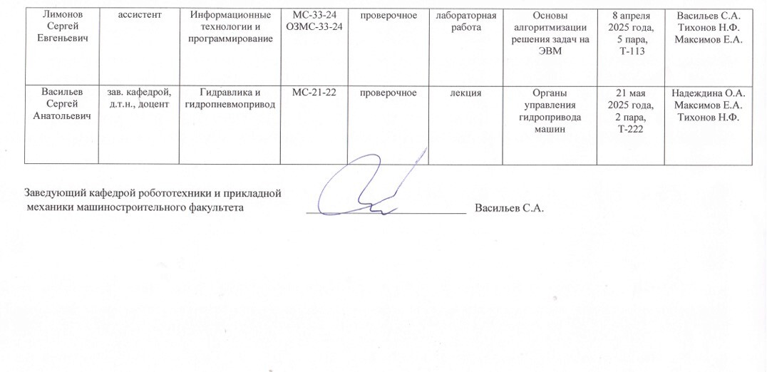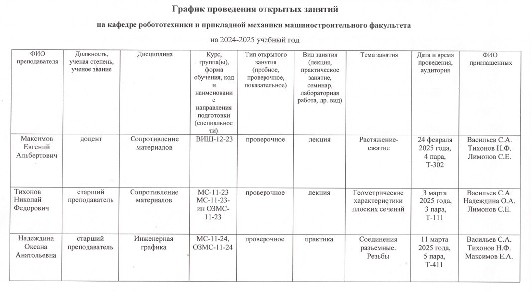 График проведения открытых занятий на кафедре робототехники и прикладной механики машиностроительного факультета на 2024-2025 учебный год