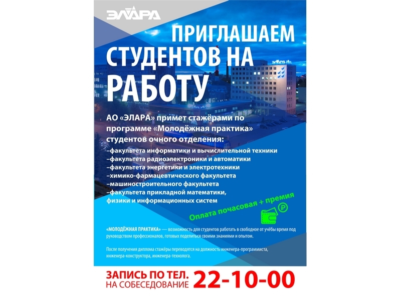 АО "ЭЛАРА" примет стажерами по программе "Молодежная практика" студентов очного отделения:
